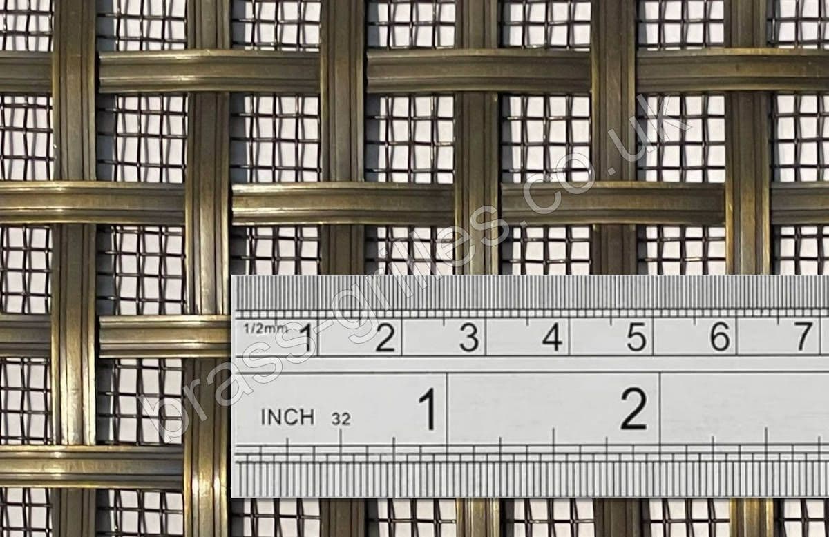 This interwoven brass decorative grille is hand woven from 5mm reeded flat solid brass wire with a square hole aperture of 10mm (between parallel wires) with a Large mesh backing attached.