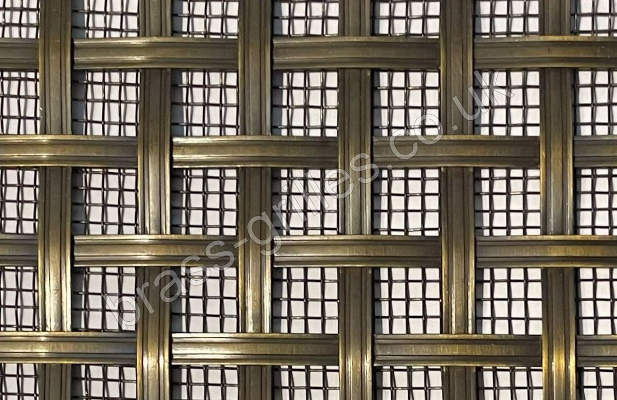 Interwoven Square Antique Brass Grille, 5mm Wide Reeded Brass Wire, 10mm Square Aperture, Large Mesh Backing.