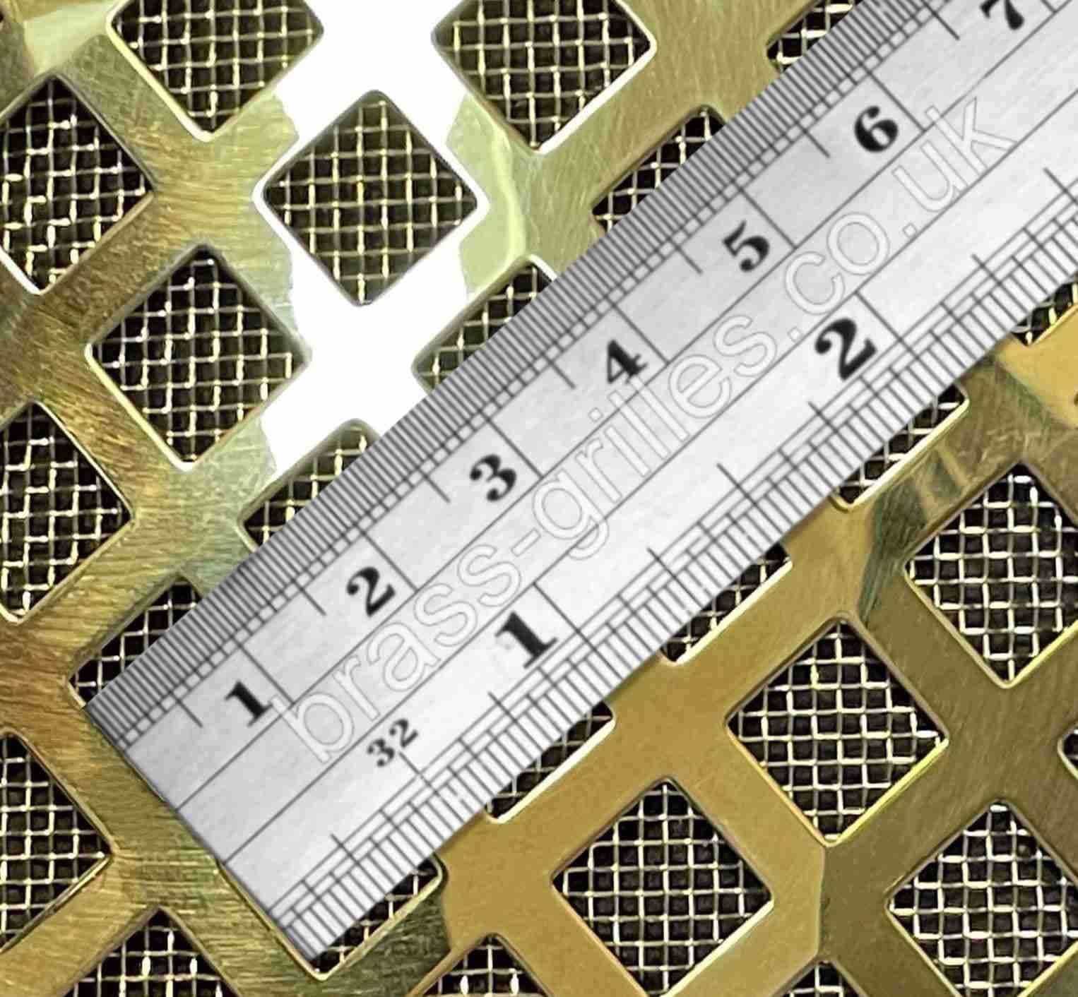 | Polished solid perforated brass grille in 10mm Diamond Hole design with a Fine brass mesh backing attached.